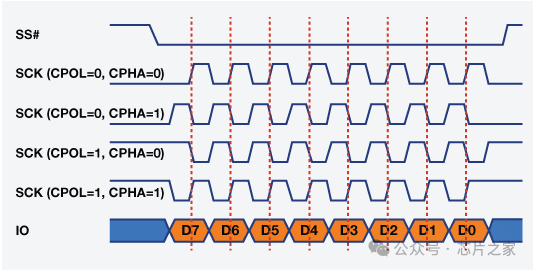 CPOL: 表示当片选信号处于高电平空闲状态的时候,SCK的电平。当为0的时候,SCK在空闲状态为低电平,反之则为高电平